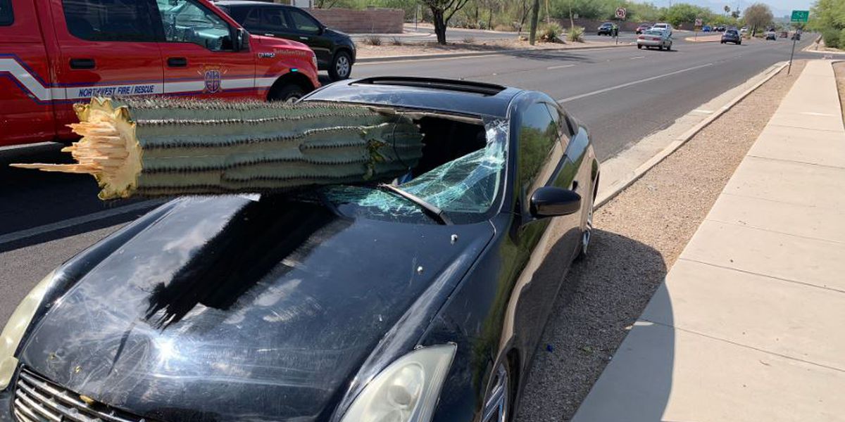 A Tucson, Arizona driver was charged with DUI after his car crossed the median and slammed into a giant saguaro cactus, which went through the windshield. He refused a breathalyzer, so the cops just held it up to the many holes in his face.