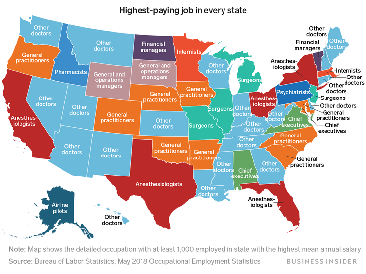 The Bureau of Labor Statistics released a map showing the job with the highest-paying average annual salary in each state. Congratulations to West Virginia heroin dealers.