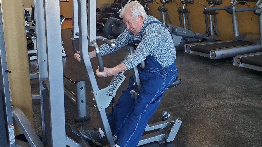 Lloyd Black, a 91-year-old who exercises in denim overalls, is ‘Member of the Month’ at Anytime Fitness in Semmes, Alabama. He says he wears baggy overalls because they’re comfortable, and they hide his excitement seeing women working out in yoga overalls.