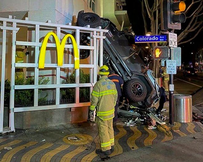 California police are investigating a man who drove a Jeep off of a six-story parking garage and crashed it into a neighboring McDonald’s – creating the first-ever “fly thru” window.