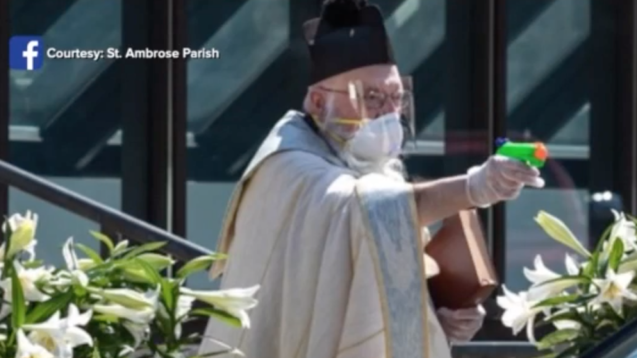 A viral photo shows a priest baptizing a baby with holy water shot from a squirt gun. The baby is welcome to return in 10 years when the priest will shoot him in the face again.