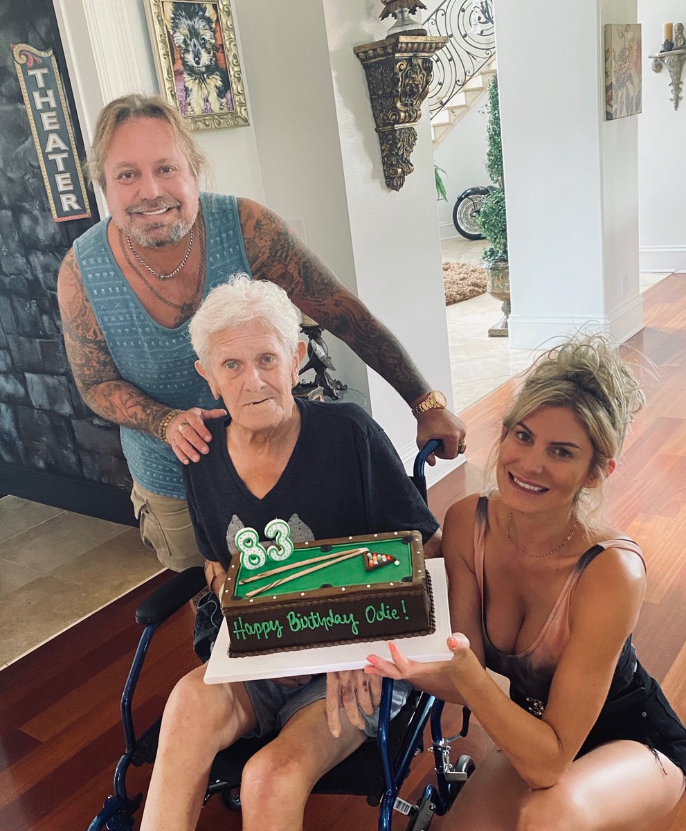 Motley Crue singer Vince Neil’s new body shape can be seen in a photo taken with his father that he posted to social media. Fans describe the new shape as “still kinda round, but less gross”.