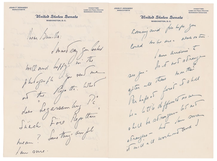 Writings from John F. Kennedy to a Swedish mistress sold for $88,000. Written in 1955 & 1956, the collection contains one full handwritten letter, and two notes asking “U up?”