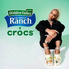Rapper Saweetie teamed up with Hidden Valley Ranch to endorse a limited edition of Crocs footwear, whose green-flecked beige color mimics the look of the salad dressing, while the rubber of the shoes mimics the taste of vegetables dipped in it.