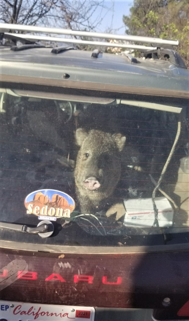 In Cornville, Arizona, a javelina jumped into an open Subaru hatchback to eat a bag of Cheetos, became trapped, and knocked the shifter into neutral, causing it to roll away. A sheriff’s deputy opened the door, allowing the javelina to escape before later dying from eating Cheetos.